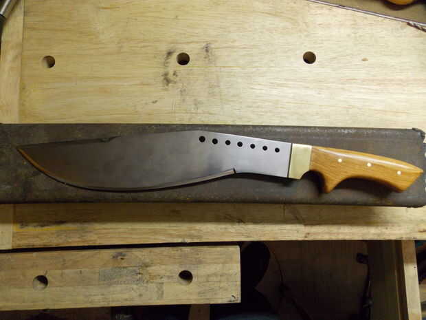 Paso diez: Otro cuchillo terminado (casi) grabó las piezas de madera de la manija y el latón pulido y a su vez grabó la parte de cobre amarillo de la manija y poner cuatro capas de barniz en la madera. Ahora todo lo que tengo que hacer es afilar el cuchillo y hacer un vestido para ella.