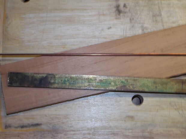 Paso cinco: Materiales para mi mango; 3/4 "x 1/8" bronce de windows desde el hospital local se re-modelada (para los cabezales delanteros y traseros); una madera de tinte rojizo de una plataforma de trabajo (las escalas); y 1/8" soldar varilla (para los remaches/pins).
