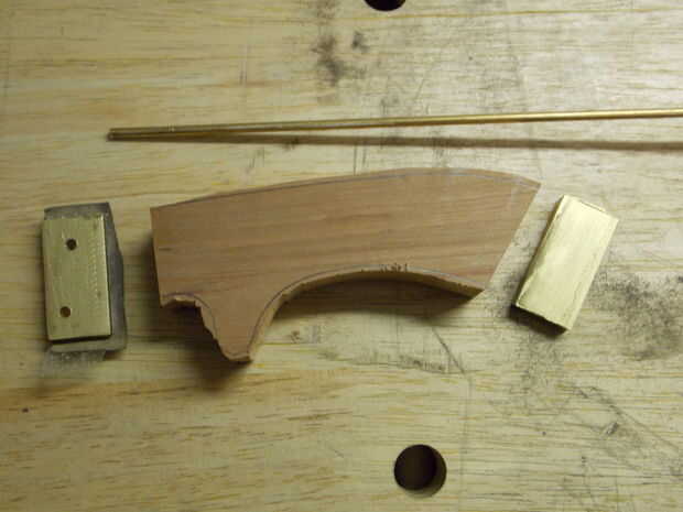 Paso 6: cortar dos secciones de la varilla de latón para cada uno de los refuerzos y dos secciones de la madera para las escalas. Necesito dos piezas idénticas para cada parte y tienen la formación de los agujeros de perno. Usé un viejo truco de carpinteros, usando dos de forma de cinta y grabar las secciones juntos antes de perforar y cortar. La forma de la manija se trazó en el corte de madera y luego áspero en mi sierra. {Asegúrese de limar y lijar el extremo del bajo en el área de Galo (donde el mango se encuentra con la hoja). Una vez que se pega no podrá de forma alguna más.}