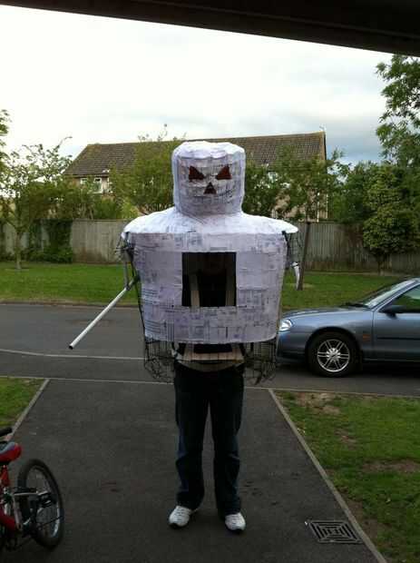 Ahora comienza la parte complicada. con un cuchillo muy afilado y un borde recto rebanan hasta cuatro años de recibos domésticos en 2" y 4" tiras (de modo que claramente iban a través de los agujeros en el cable) y a partir de la parte inferior de la cáscara, capas les para arriba como Tejas después de la inmersión de cada uno en una mezcla de agua y pegamento PVA (agua alrededor de 10 a 1 de pegamento). El interior de la cáscara se reforzó con algunos varilla de acero de 4mm que pasado de moda en dos semicírculos, montados en frente y espalda y luego tachuela soldada con autógena los extremos juntos para formar un anillo fuerte. Se agregaron dos postes de aluminio c-canal y taladrar agujeros en ellos para soldadura alambre siendo torcido a través para celebrar todos juntos. Casi puede ver el arnés interno que está conectado a los puntos fuertes dentro junto a la banda de la cintura para evitar que se vuelque hacia adelante. Los brazos en esta etapa son sólo viejos postes de la carpa doblado a la forma y alambre atado y soldada en su lugar.
