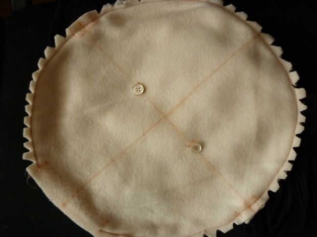 Cuando los ojos están hechos, poner las orejas en los bordes de la cabeza, para que las partes redondeadas se dan vuelta hacia los ojos. Coloque la segunda pieza de la tela principal en la parte superior y coser alrededor, dejando 10cm (4 in) en el cuello.