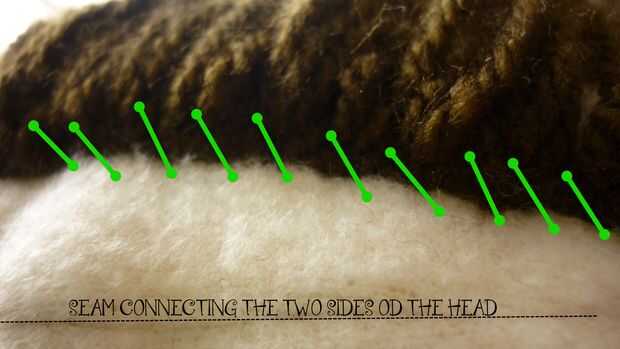 Coser el pelo en la cabeza con hilo marrón o negro oscuro.