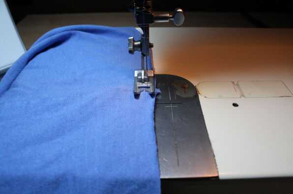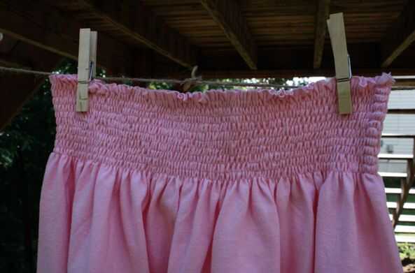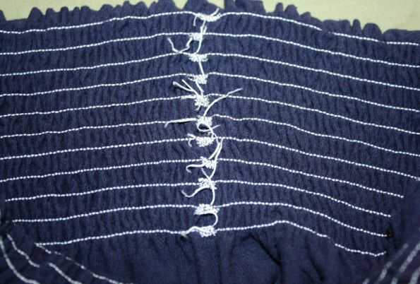 Ahora, romper una regla de plisado. Las instrucciones le dirá que deje sus hilos y atarlos. Bueno, me tiré a esa regla la ventana 6 faldas y 2 vestidos hace! Cuando empiezo a coser, regreso coser unas puntadas, luego coser todo el camino alrededor de la falda. Cuando vuelva a mi punto de partida, que volver puntada dos veces (así que de nuevo 3-4 puntos, adelante 3, 3 atrás, 3 adelante) deje mis extremos elásticos de 1/4" de largo.