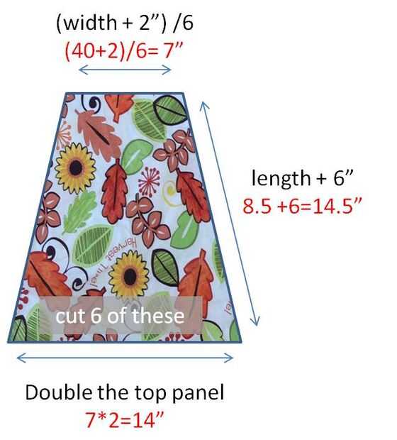 El ancho de la parte superior del panel será el ancho de su enagua plus 2" dividido por 6. (Queremos que el ancho total de la sobrefalda a ser lo mismo que las enaguas por lo que estamos añadiendo 2" para tener en cuenta el margen de costura al coser los paneles para formar la sobrefalda). Así que para mí su 40" plus 2, que es 42" dividido por 6. La parte superior cada uno de mis grupos será 7" de ancho.