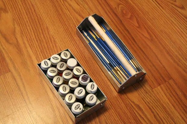 En esta categoría, tengo mi caja de pinturas y pinceles. Las toallas de la tienda guardar en una carpeta de archivo muy bien hasta que necesite. También tengo una carpeta de archivo con diferentes granos de lija, con papel para bocetos e ideas y uno de papel de transferencia de agua y la lupa de la hoja. Las carpetas son fáciles de caber en la caja solo ponen encima las cosas en la parte inferior.