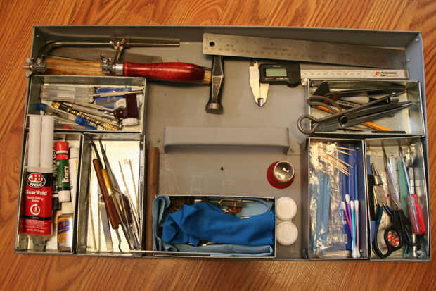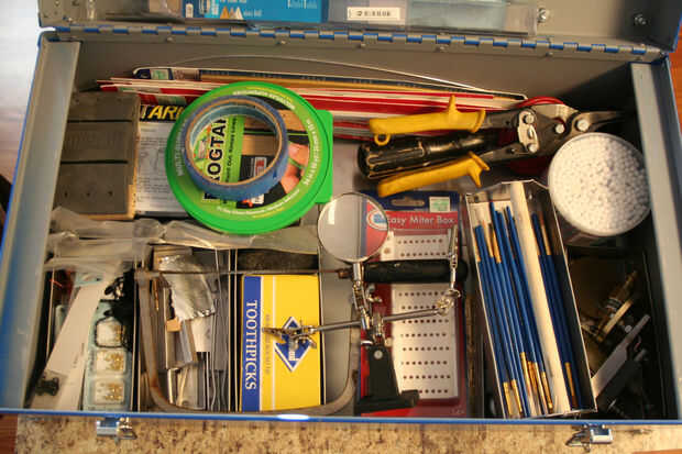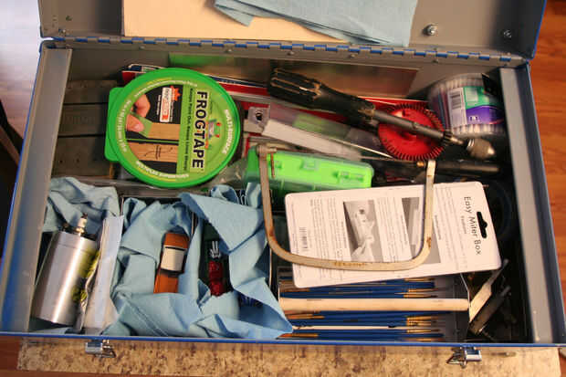 Esto realmente corresponde a sus preferencias personales, pero pongo todas las cosas que uso a menudo en la bandeja superior. Esto incluye la mayoría de las herramientas pequeñas y algunos suministros simple. Todo lo demás va debajo. Tengo un montón de cosas aquí, así que su llena bastante bien. Tómese su tiempo, probar unos escenarios hacia fuera y encontrar lo que funciona mejor para usted. No tenga miedo de cambiar como empezar a usar que su taller móvil-parte del proceso de diseño es evaluar lo que está haciendo y realizar cambios si es necesario!