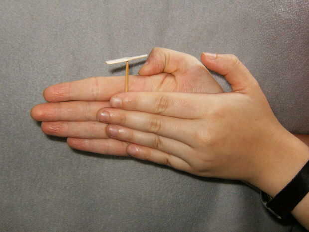 2. Sostenga el palillo contra Palma de la mano derecha con los dedos de la izquierda. Swifly funcione con sus dedos con el palillo de dientes a lo largo de su mano y dejar ir.