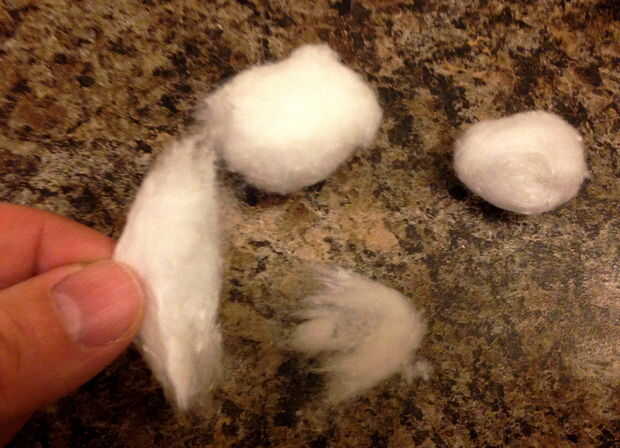1. con unas tijeras afiladas, corte cada bola de algodón por la mitad, luego tire de cada mitad en un mechón suelto. Está bien si los mechones caen en pedazos.