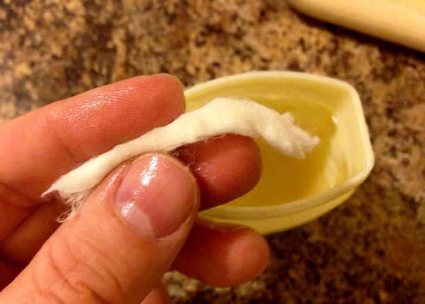 3. Enrolle el mechón de algodón con la pequeña cantidad de vaselina alrededor con los dedos para trabajar en las fibras. Una vez más, el objetivo no es para saturarla, pero lo suficientemente húmeda para que el algodón ya no es "esponjoso". Use el algodón para limpiar el exceso de dedos y regresar a sí mismo.