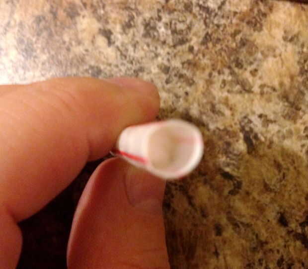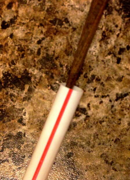 1. trabajando desde el extremo abierto de la paja, continúe alimentando las partes de la bola de algodón impregnada en él, usando un palillo para apisonar como vas. No quiero empacar demasiado... en la segunda foto que puede hacer algo el comprimido poco de algodón en el extremo cerrado, con la línea oscura de los palillos visible.