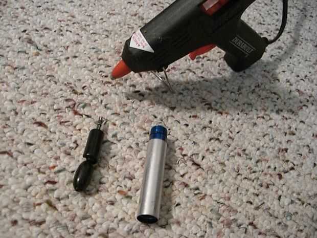 Espere a que la pistola de pegamento caliente para calentarse y primero poner un pequeño punto en un lado de la linterna junto con el micrófono (ver 2 º y 3 º imagen) y esperar unos 10 segundos para se seque para que tengas soporte para pegar el resto sin sostenerla o accidentalmente quema a sí mismo