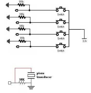 El circuito de interruptor para nuestros cuatro interruptores "dedo del tacto" y un circuito de piezo para nuestro sensor de "golpe" de la respiración.