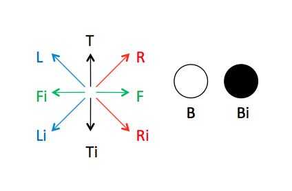 Cada plano del cubo se puede girar hacia la derecha o hacia la izquierda en relación con el resto del cubo. Mientras presiona el cubo frente a ti, estos planos se identifican como frente (F), top (T), derecha (R), izquierda (L), nuevo (B) y (D). Cada letra indica una rotación en sentido horario de 90 grados del plano correspondiente. Rotación hacia la izquierda o invertida, se indica añadiendo una "i" a la carta: Fi, Ri, etc..