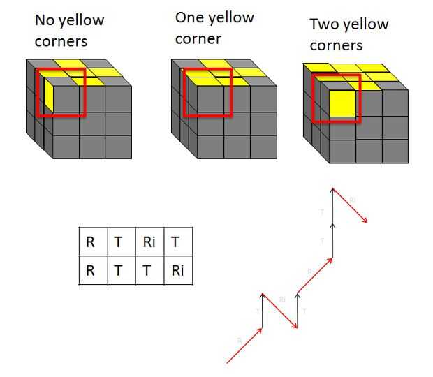 Aquí, fíjese en la orientación del cubo, también. Depende de cómo muchas piezas de la parte superior son de color amarillos. Repite el algoritmo hasta que la parte superior entera del cubo es de color amarilla. A fijar la orientación de las esquinas y los bordes en los siguientes pasos.