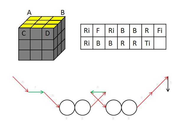 El objetivo aquí es resolver las cuatro esquinas superiores. Antes de empezar, dos piezas de esquina tienen que colocarse correctamente en lugar de A y B o A & D o B & C, girando la capa superior.