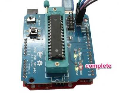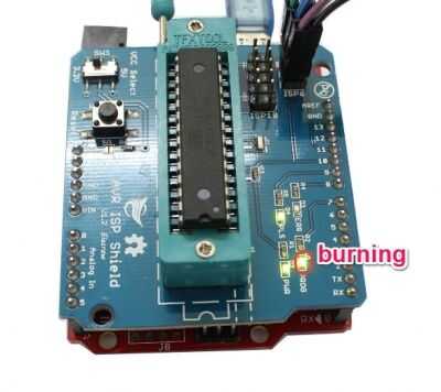 Cuando se quema el cargador de arranque, usted verá el LED(PROG) en AVR ISP escudo está parpadeando, y se pondrá hacia fuera cuando complete la quemadura.