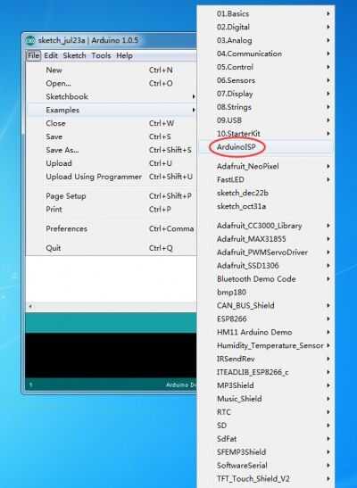 Abrir el firmware ArduinoISP (en contexto) en el Arduino IDE(File>examples>ArduinoISP)