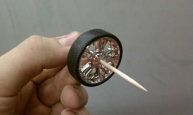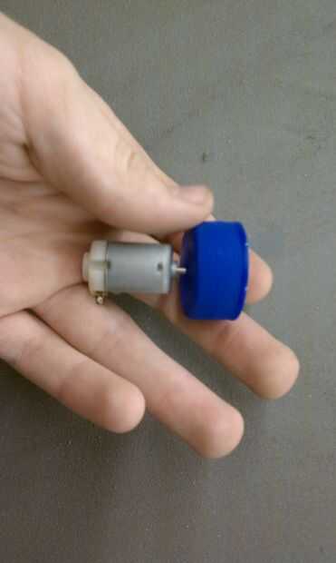 En primer lugar, perfore un pequeño agujero en la rueda (cápsula) por lo que coincide con el tamaño del eje del motor. Puede ser un poco apagado, pegamento caliente arreglarlo más tarde. Una vez han perforado de las ruedas traseras, rueda delantera de la opción del taladro. Mina fue en la rueda de un coche RC que CiU tenía un agujero parcial. Pero puede usar cualquier cosa redonda! Para la rueda delantera, poner el diente toma en para asegurarse de que no está demasiado apretado. Si está demasiado apretado, que no ruede. Por lo tanto, ahora debe tener tres ruedas de algún tipo con un agujero en el centro de cada uno.