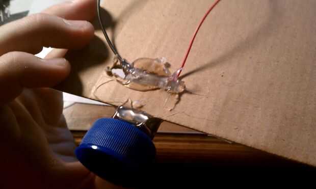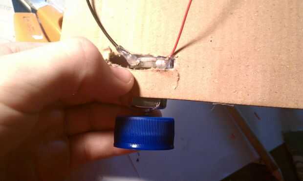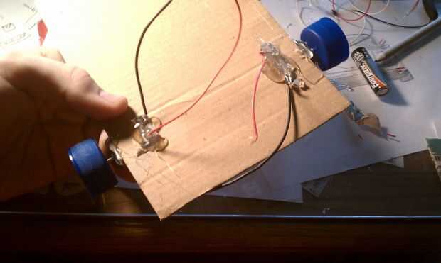Otra vez, conecte la pistola de pegamento caliente, que va a utilizarlo. En primer lugar, alinee el motor con la rueda a donde quieres ponerlo. Use el lápiz para marcar donde irán los cables a través de la base. A continuación, utilice unas tijeras para recortar el área que usted marcó. Ahora, agarra de sus motores y una batería. Invirtiendo los cables a la batería (+ y -) determinar de que manera el motor gira y marca en un pedazo de papel o algo asi cual cable (es decir, rojo, azul, etc.) va al + de la batería y que va al-. Una vez que haya terminado y usted sabe que forma de poner sus motores, ponerlas en los agujeros corte y pase los cables por los agujeros. Luego agarra la pistola de pegamento caliente y Bañe con pegamento. Poner en ambos lados del motor para asegurar para que no caiga. Una vez que ambos se hayan secado, debería verse algo como la foto final.