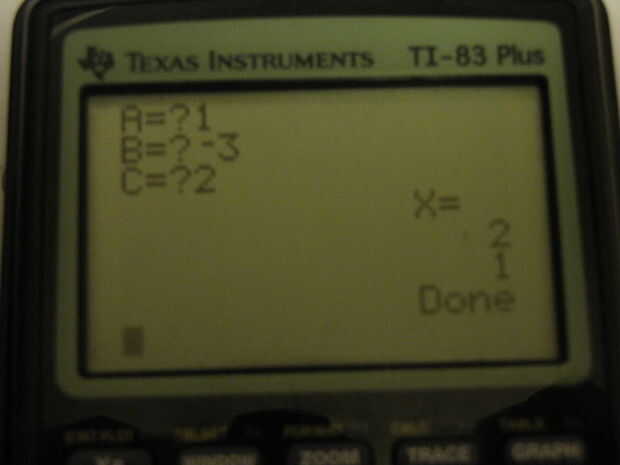 Ahora insertar el programa y seleccionar el que acaba de hacer. Golpe entrar y escriba en el valor de la A. Entonces hacer esto para B y C. Recuerde ax ^ 2 + bx + c = 0. Ejemplo: x ^ 2-3 x + 2 = 0; A =1, B =-3 (uso signo negativo si es necesario), C =2. Los números en negrita son los números que introduzca en su programa. Después de introducir todas las tres variables golpeó entrar y obtienes tu respuesta.