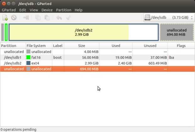 Cuando la imagen se termina quemando, el contenido de la unidad debe buscar más o menos igual que en la imagen de la pantalla de GParted. Debe tener una partición fat16 y partición una ext4 y tal vez algún espacio sin asignar si tu disco es bastante grande.