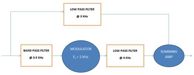 En primer lugar, el filtro paso de banda aísla la información de alta frecuencia que queremos cambiar de puesto - en concreto, 3 kHz para la banda de 5 kHz.