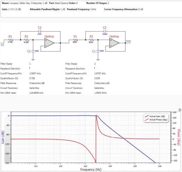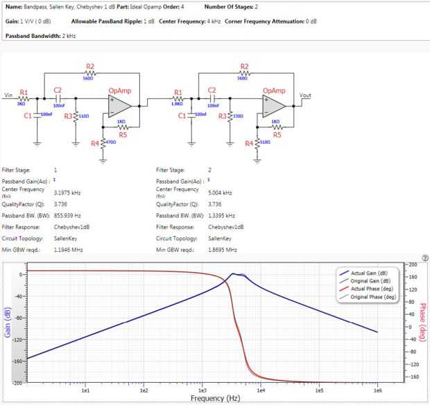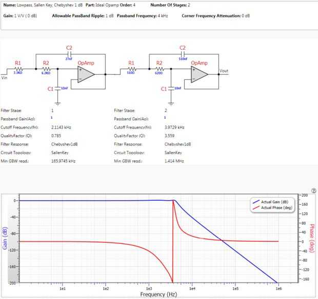 Para aplicación de filtro, elegimos utilizar 4 º orden Chebyshev 1db tipo de respuesta con la topología de la Sallen-Key. Chebyshev se recomienda para su atenuación de agudos - importante para las bandas de frecuencia ajustada es necesario para esta aplicación (considere el segundo filtro de paso bajo. Tenemos una frecuencia de corte de 4 KHz y necesita eliminar por completo los componentes de frecuencia en 6 KHz.). Sin embargo, esta zona es un espacio de diseño donde el implementador puede probar cosas diferentes para obtener resultados diferentes!