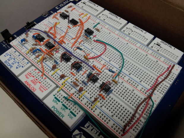 La jac audio macho conectarse una fuente de audio (iPod, smartphone, PC, etc.) y conecte los cables a la entrada de su circuito. Usando los conectores de audio hembra, conecte un par de auriculares (o un audífono) a la salida del filtro de paso bajo de 3 kHz y otro a la salida del amplificador sumador. La salida del amplificador sumador debe ser perceptiblemente para verduras, especialmente para la música con tonos de alta frecuencia (tambores de trampa, palmas, voz femenina, etc.).