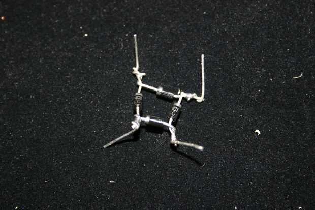 Crear un puente de diodos (ver esquema en el paso número uno).  Esto permite el voltaje generado por el montaje del motor (CC motores actúan como generadores cuando) a salir siempre de forma predecible, independientemente de cómo esté el motor (generador de ahora).  Utilizar un puente de diodos para cada conjunto del motor que alimenta el condensador y condujo en lugar de uno al otro.