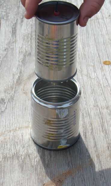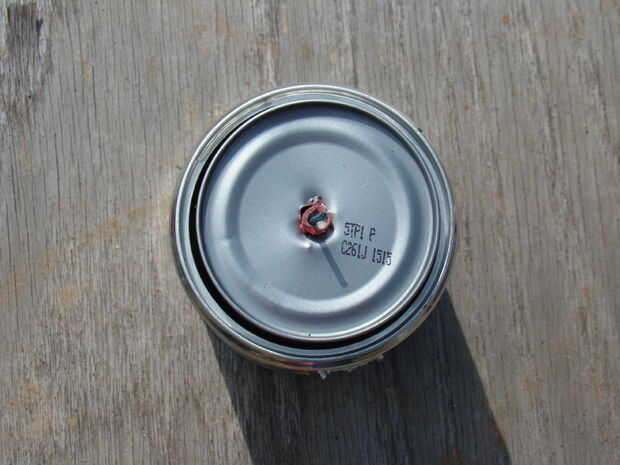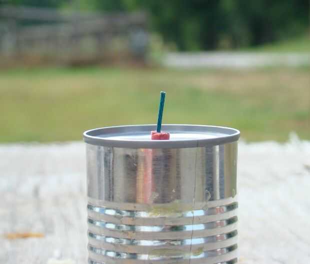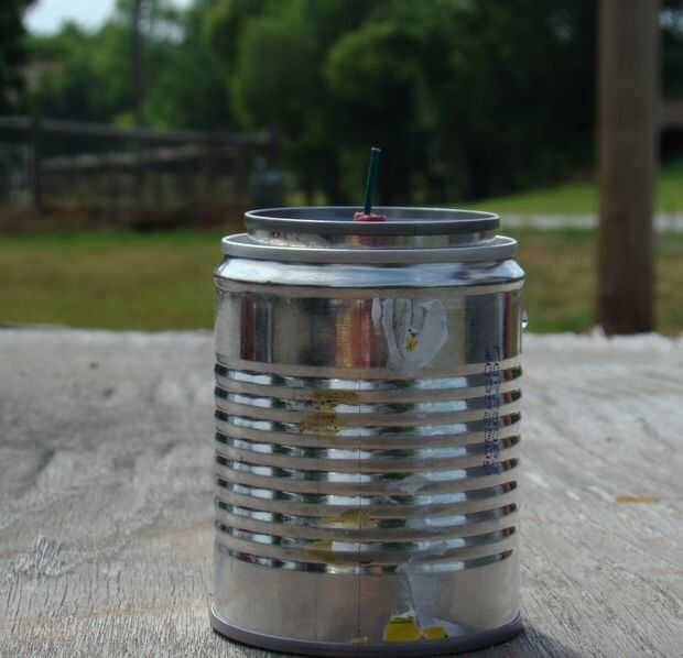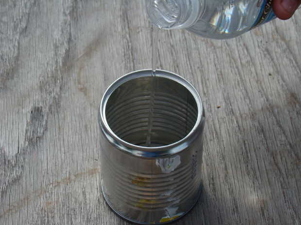 Insertar la galleta del fuego en la parte inferior de los pequeños puede hasta que muestra sólo la punta del mismo. Añadir agua a la lata más grande. Esto será en algún lugar entre 1/8 y medio llena. En todos nuestros lanzamientos tenemos aproximadamente la misma altura independientemente de cuánta agua se utilizó. Después de agregar el agua a la lata más grande, inserte la lata más pequeña con la galleta del fuego que. La lata se hundirá hasta el fondo sin ninguna fuerza.