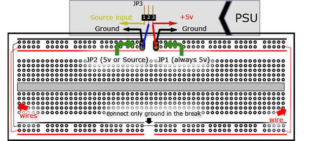 Así que la fuente de alimentación terminado va a ser conectado en la placa encima de la rotura, ofrece 2 diferentes o una salida voltajes. Hice una ilustración de esto para hacerlo más claro para usted. Tenga en cuenta que tu protoboard también debe tener una rotura en las líneas de energía. Y si lo hace no pueden ajustar la fuente de alimentación para que sea sólo proporcionan 5 voltios por ejemplo. Pero creo que sigue siendo una buena fuente de alimentación debido a su pequeño tamaño.