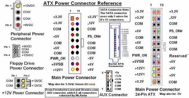 Vamos a utilizar 4 x negro (COM), amarillo x 2 (12V), color rojo x 1 (5V), naranja 1 x (3, 3V)(my is purple) y verde (PS ON)(my is grey).