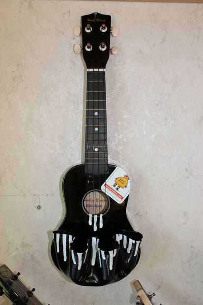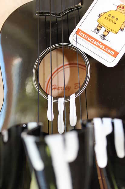 Aber einfach eine Schüssel zu füllen und diese als Inspirationsquelle zu betiteln, wäre ziemlich einfallslos. También habe ich eine Vinylschüssel gemacht, diese halbiert und eine Hälfte auf eine ukelele geklebt. Zusätzlich habe ich das Gebilde noch mit gemalten Wassertropfen (und einem pegatina de Instructables) verziert und aus der einfachen Schüssel wurde ein sehenswerte und dekorative "Quelle der inspiración".
