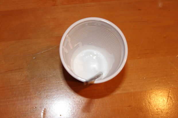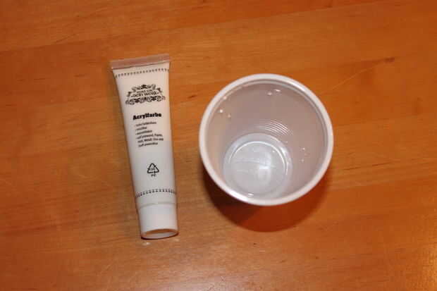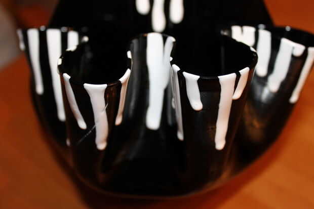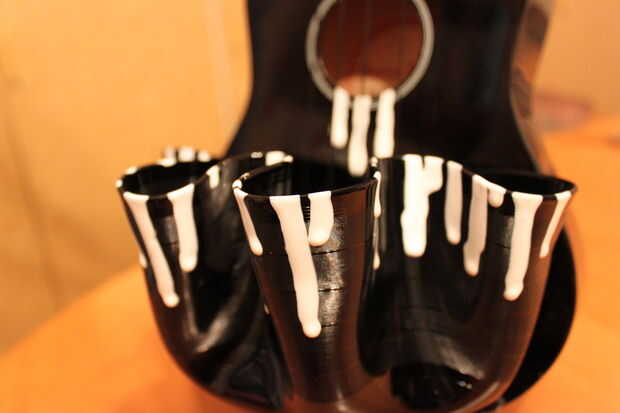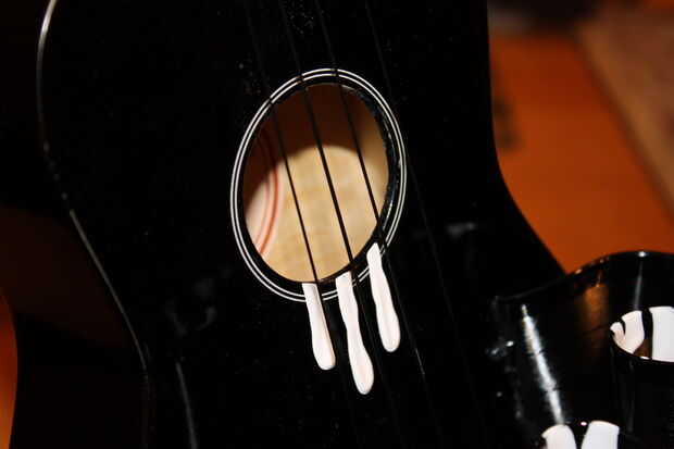 Mische etwas Acrylfarbe mit ganz wenig Wasser, um die Farbe dünnflüssiger zu machen. Ich habe mich für weiße Farbe entschieden, wegen dem schönen Kontrast zur schwarzen ukelele und Vinylhalbschüssel. Um solche coolen hinzubekommen Tropfen, nimm etwas von der verdünnten Farbe auf den Pinsel und lasse diese von der runterfließen Kante der Schüssel. Así bekommt hombre realistische Wasserspuren. Lass die Farbe über Nacht trocknen.