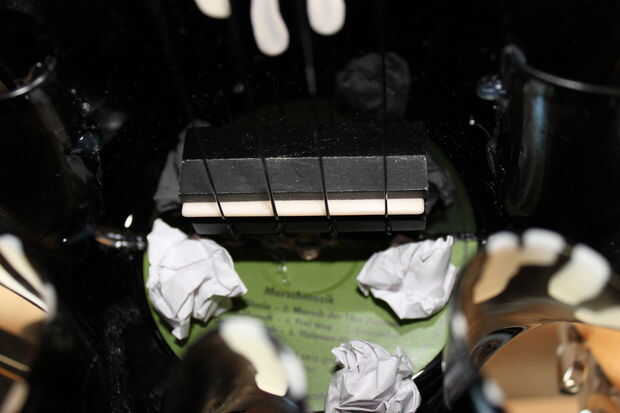 Wenn wir es un die Wand hängen wollen, müssen wir ein Loch en die Kopfplatte bohren. Man kann aber auch eine Wandhalterung oder einen Gitarrenständer benutzen.
