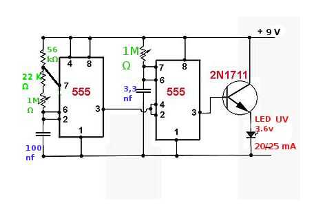 Con este circuito se obtiene una luz estroboscópica con frecuencia y ciclo de trabajo ajustable mediante potenciómetro dos ambos.