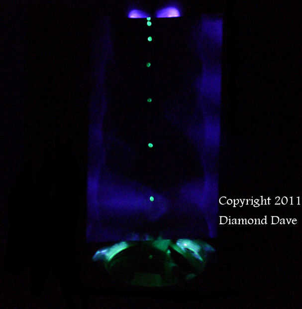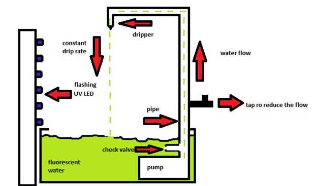 Hice esta fuente con una pequeña bomba de agua sumergible dentro de un tarro decorado, agua fluorescente (con tinta de marcador) y LEDs de UV, para obtener luz del estroboscópico, usando un circuito de luz estroboscópica simple basado en un par de ne555 (con un ciclo de trabajo bajo).