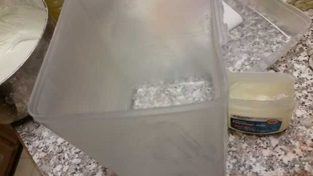 .una caja plástica. mina era para almacenar harina pero tiene que ser más alto que la manzana. foto muestra el