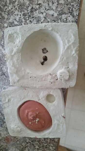 Primero si hay pequeñas burbujas de aire a suavizarlos con grasa. Llené la parte inferior la mitad con el color del cemento y sacudió para conseguir la out.then de burbujas de aire poner a la segunda mitad de nuevo y llenar tanto y agite pero poner presión en la parte superior porque ot se levantará. Algunos salen los lados. esperar un día.
