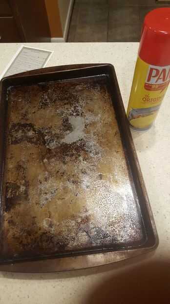 Usando Pam en aerosol (o el aerosol de cocina preferido de su elección), ligera capa toda la hoja para hornear que llevará a cabo las cookies.