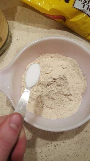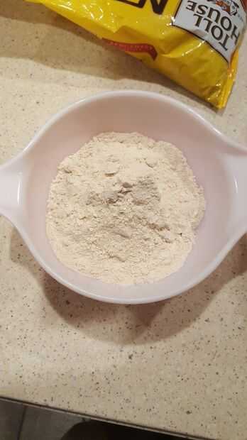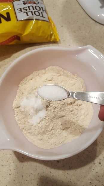 Vierte las 2 1/4cups de harina en un tazón mezcla tamaño mediano, junto con 1 cucharadita de sal y 1 cucharadita de bicarbonato de sodio.