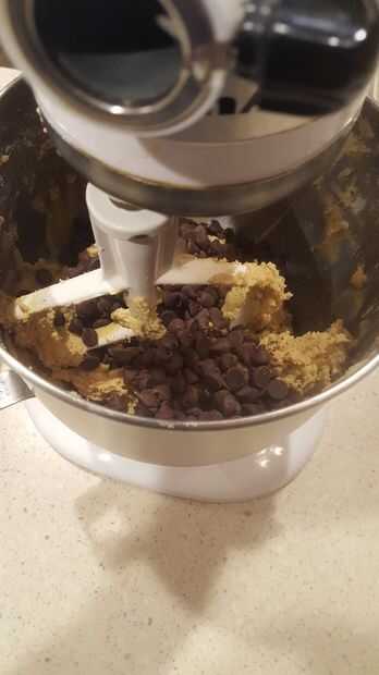 Vierta 2 tazas de chispas de chocolate en la mezcla de pasta de la galleta y mezcla en alta durante 8 a 10 segundos. Esta mezcla es muy corta porque sólo quiere mezclarlas en lo chips de chocolate no crush.