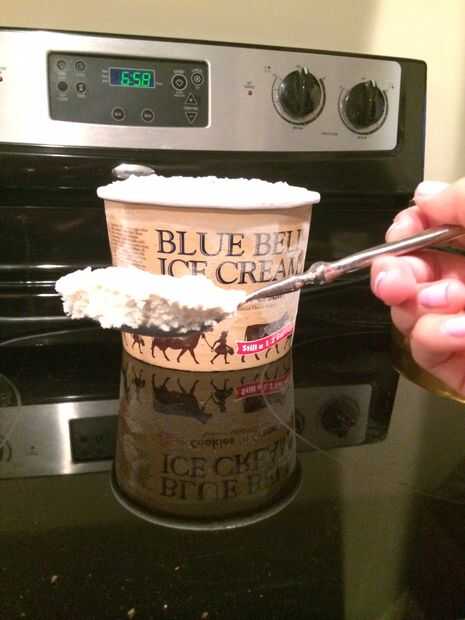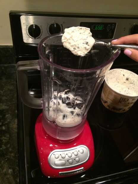 Con su cucharada, cucharada 10 cucharadas de Blue Bell Cookies y helado de crema, colocar cada cucharada en la licuadora uno a la vez.
