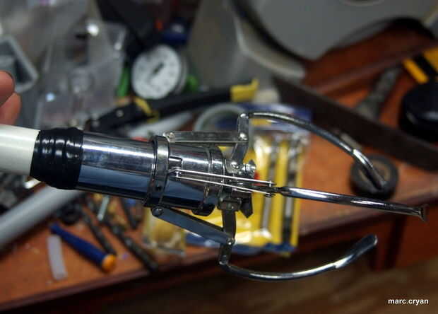 El tubo tiene que ajustarse perfectamente en el cuerpo de la uña. Envuelva el extremo del tubo con cinta aislante hasta que es es densamente bastante que usted puede atascarse en el cuerpo de la uña y permanecerá. Pase el cable a través del tubo por lo que sale al final de la uña. Al tirar el cable de la pinza debe cerrar.