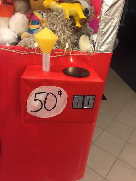 Usé una cajita que recibí de trabajo gratis para hacer el área de joystick y dinero. Yo envuelto en papel rojo por separado y luego caliente pegué a la caja más grande. El botón grande está hecho de cartón y de color negro (pintura o sharpie que ambos funcionan muy bien). Usé papel de aluminio para hacer las ranuras de moneda, usando un marcador negro fino para los bordes. Usé un trozo delgado de papel para escribir a mano el precio con el mismo marcador negro fino. La ranura del premio se hace con un pedazo de cartón cubierta en papel de aluminio, pegado directamente a la caja más grande.