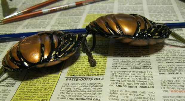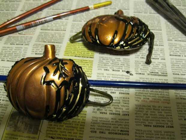 En una tienda local de segunda mano encontré esta colección de servilleteros de cobre en forma de calabaza. Arrancó los anillos y me ajustaron un par de calabazas juntos, espalda con espalda. Su forma asimétrica significa que hubo un cuarto de pulgada de espacio en cada lado, así que llena el espacio con pegamento y pintado negro y oro.