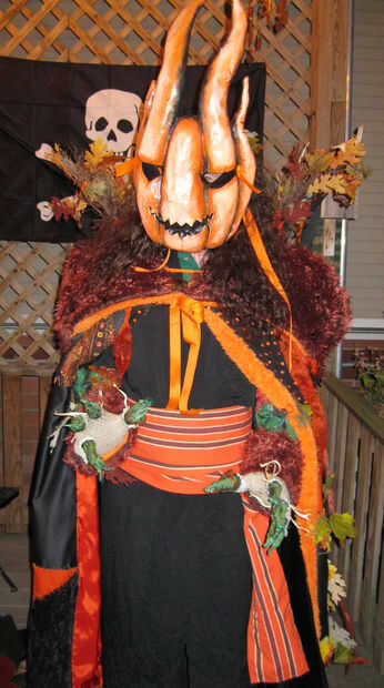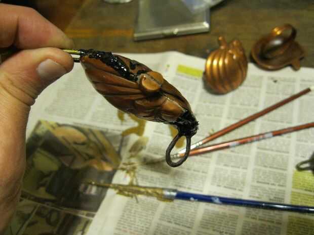 Originalmente hice dos de estos, con lazos de alambre incrustados en la cola para que yo pudiera tener alguna manera de adjuntar a la demanda. En última instancia, sin embargo, no me gustaba lo colgaron, usé sólo uno de ellos. Había cosida a un lado el collar y había cosido un lazo de cuero pequeños al otro lado, por lo que acababa de usar un broche calabaza cobre. Era más decorativo que útil, y probablemente incluso nadie notó que estaba allí. Pero me gusta.