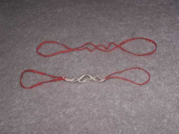 I used 6 Rubber Bands- 2 Sets of 3 Rubber Bands. Cada conjunto tiene 3 bandas knoted juntos en una cadena.