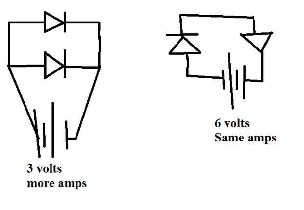 Hay 2 formas para conectar LEDs juntos. Uno es ellos cable Annode Annode cátodo a cátodo que se ejecuta en el mismo voltaje pero mayor amperaje. el otro es cablear ellos annode a annode cátodo a cátodo. Tendrá un voltaje más alto pero un amperaje más bajo.