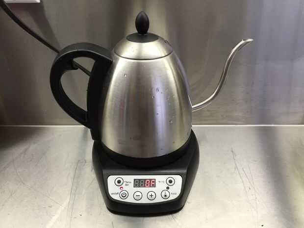 El agua no debe estar hirviendo. Eso hará que el café amargo. 180° F es ideal, un poco más fresco para asados oscuros, un poco más de luz. Si tienes un hervidor de agua con control de temperatura, muy bien. Aquí es cómo utilizar el que tenemos en estudio 9: